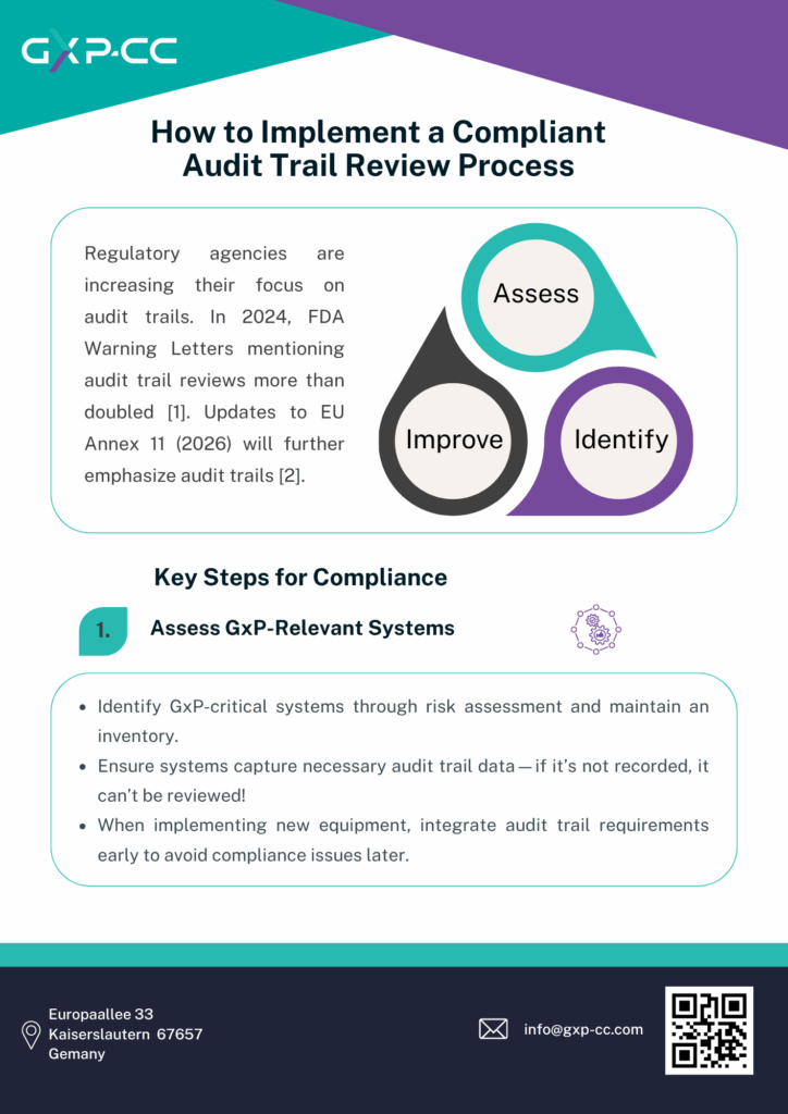 - Evaluate GxP-Relevant Systems: Start by assessing which systems are subject to GxP requirements and ensure they are capturing audit trail data completely and accurately. A clear understanding of your system landscape is key.