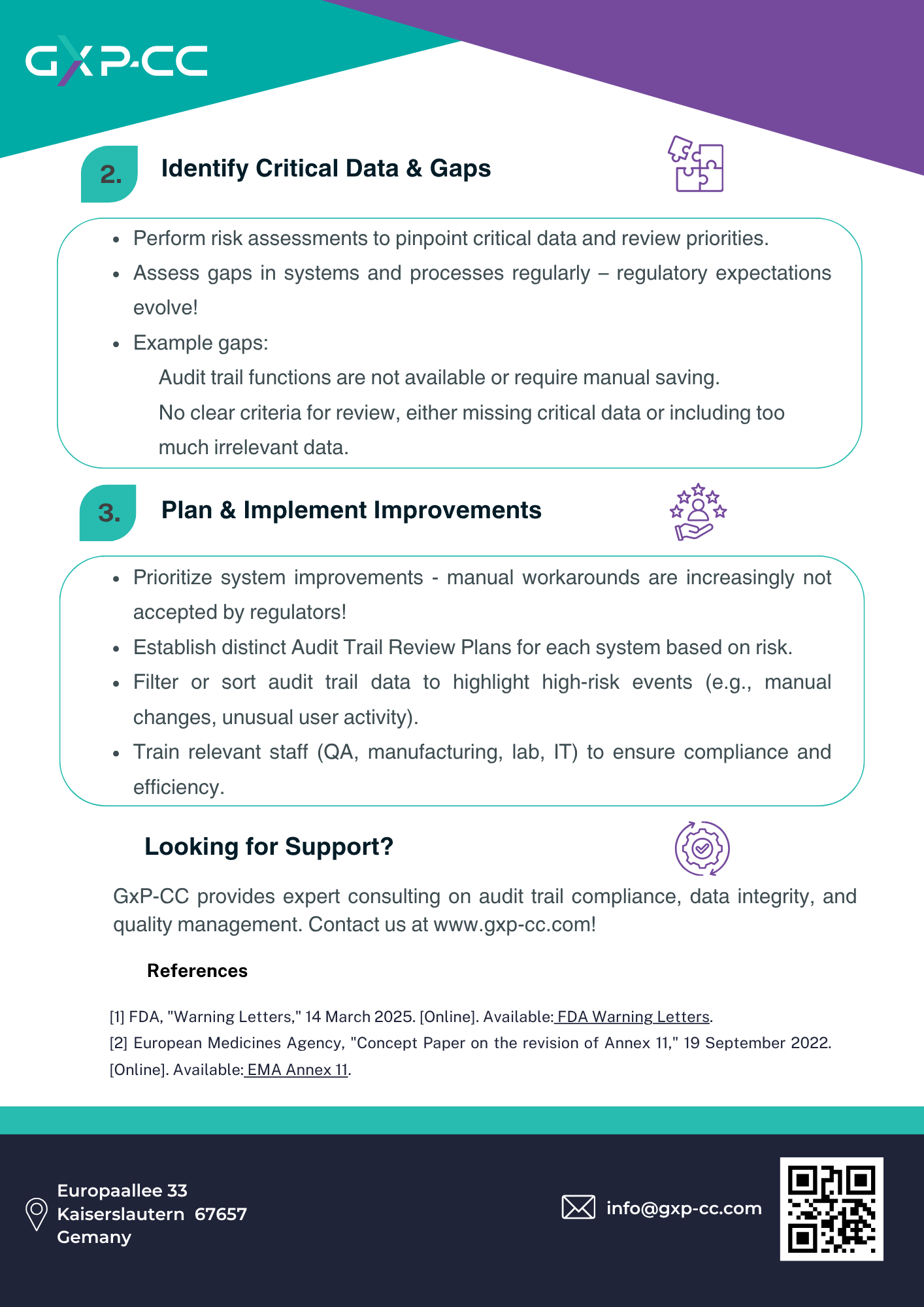 - Evaluate GxP-Relevant Systems: Start by assessing which systems are subject to GxP requirements and ensure they are capturing audit trail data completely and accurately. A clear understanding of your system landscape is key.